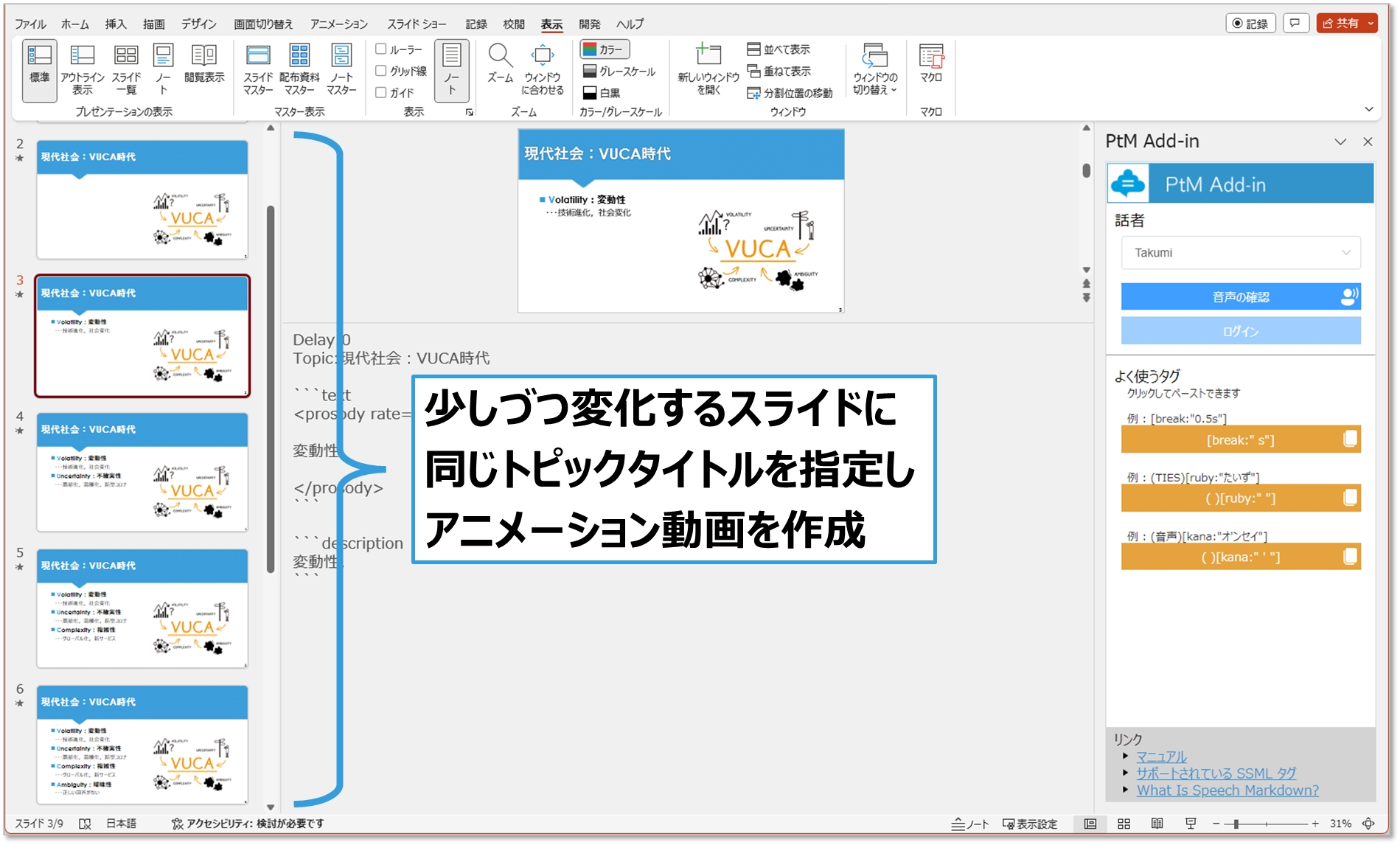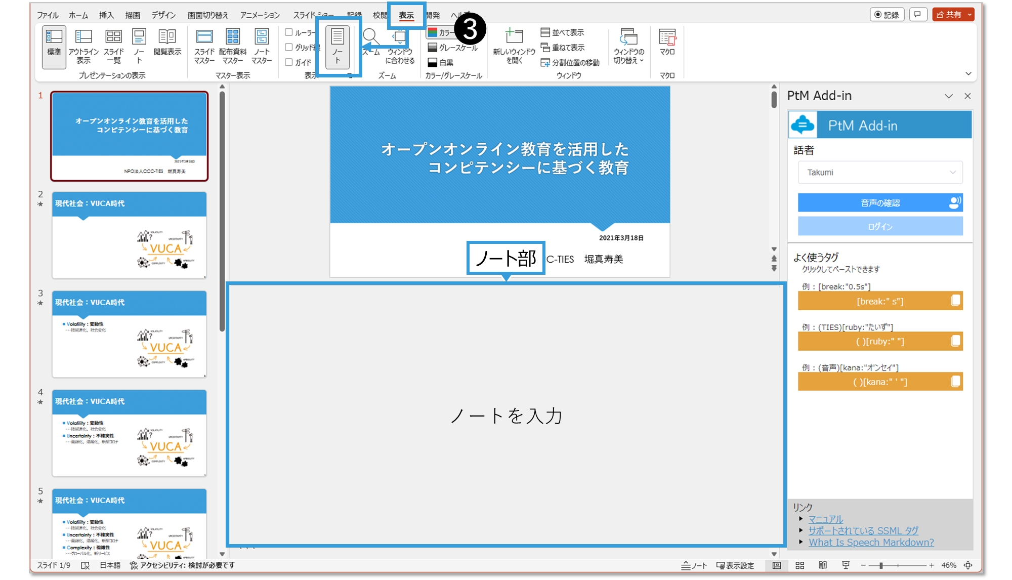 各スライドのノート部にナレーション原稿を記載すると,合成音声でスライドを解説する合成音声付き動画教材を作成することができます.