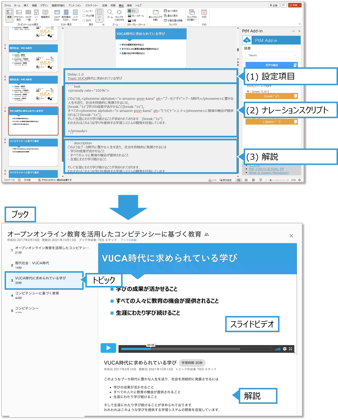 動画教材はスライド毎に動画が分割されており,分割された動画を 「トピック」 ,動画教材全体を 「ブック」 と呼びます.