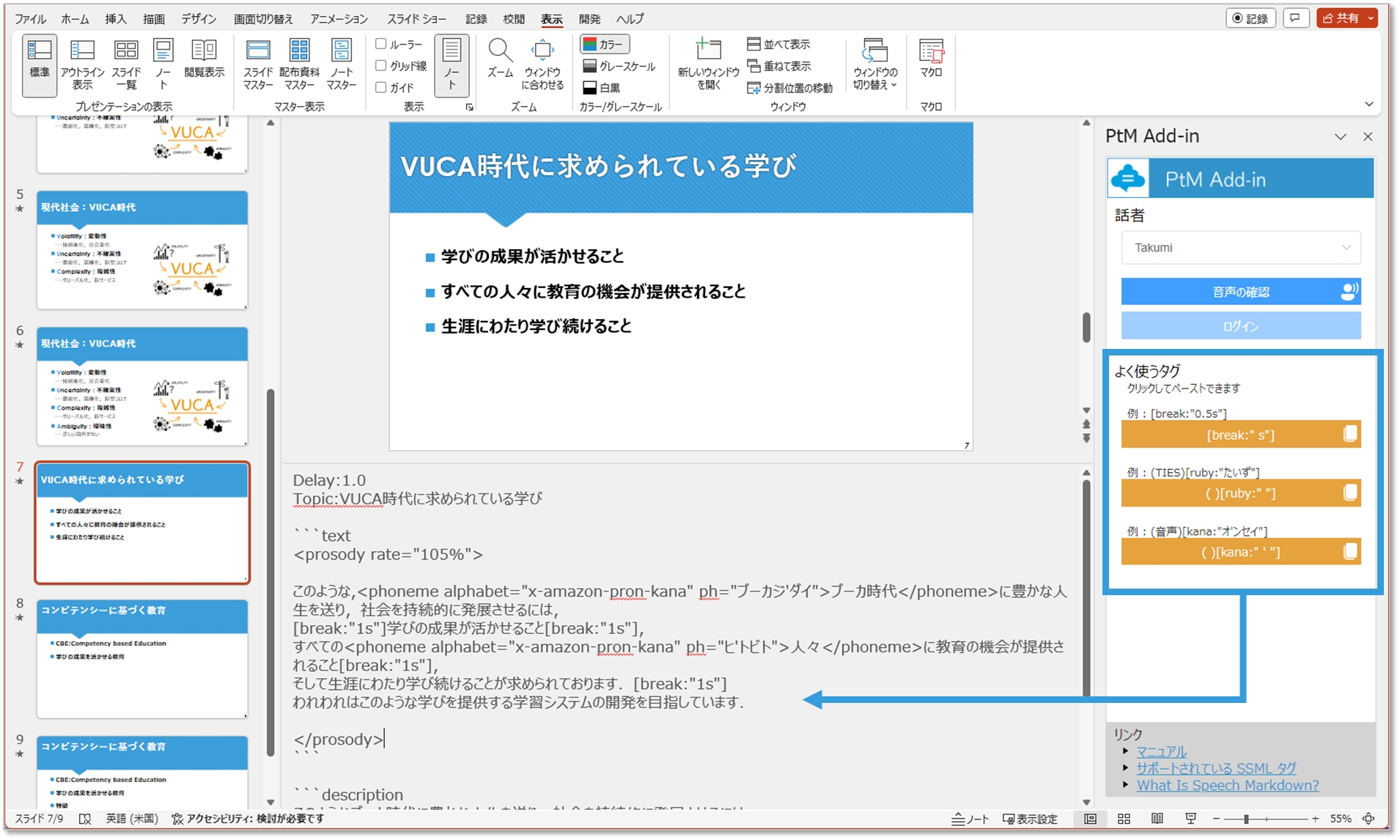 ```SSMLタグやSpeechMarkdownの詳細は以下を参照してください.