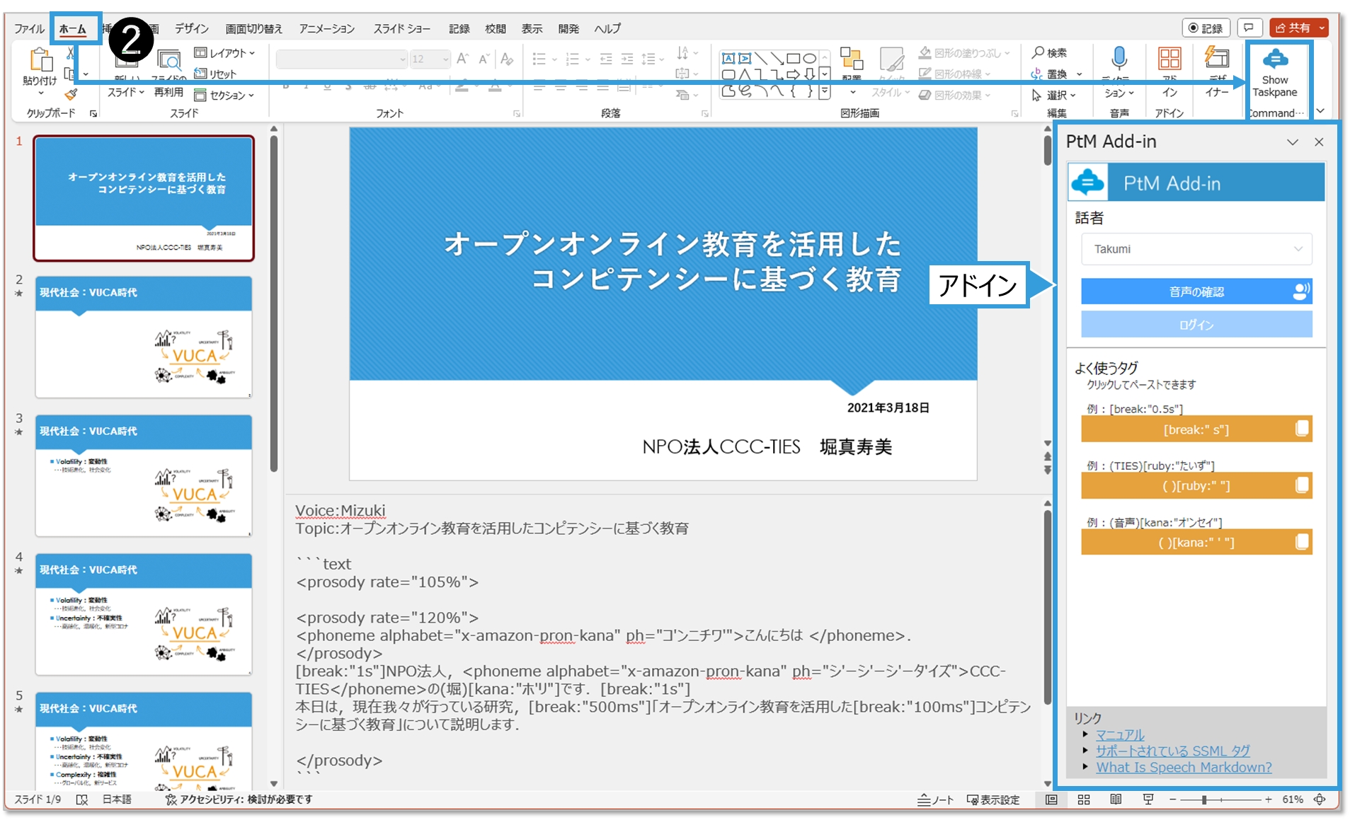 ❷ パワーポイントのメニューの 「ホーム」→「PtM Add-in」 をクリックし.アドインを表示します.